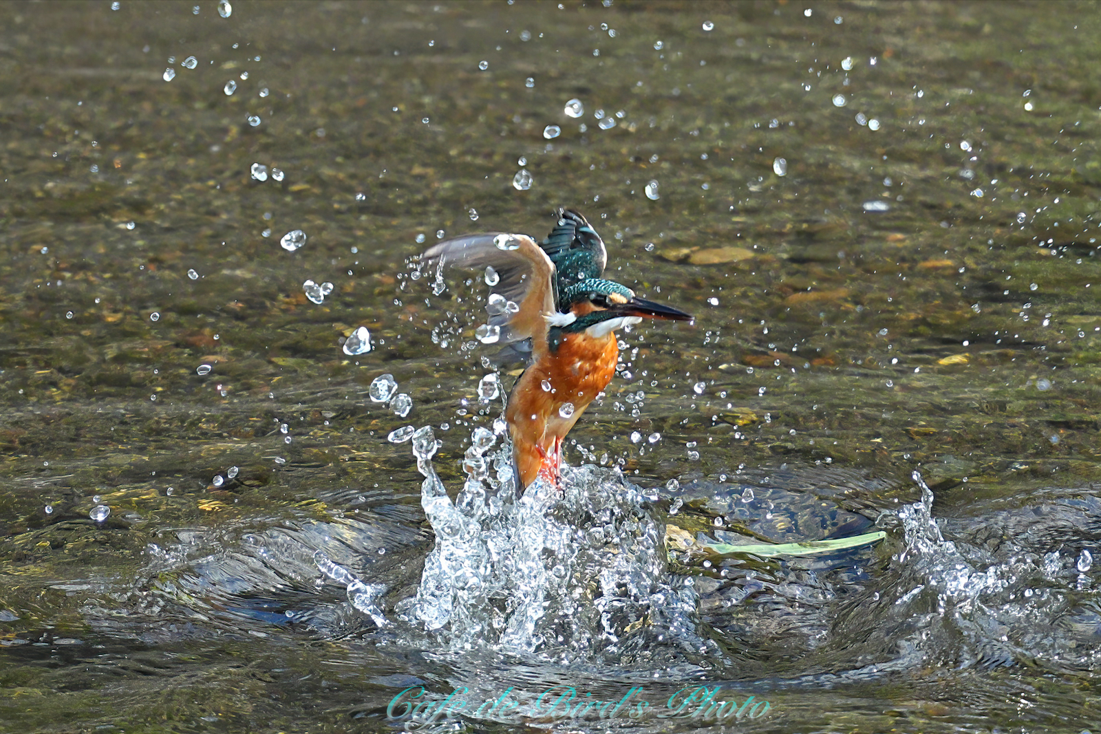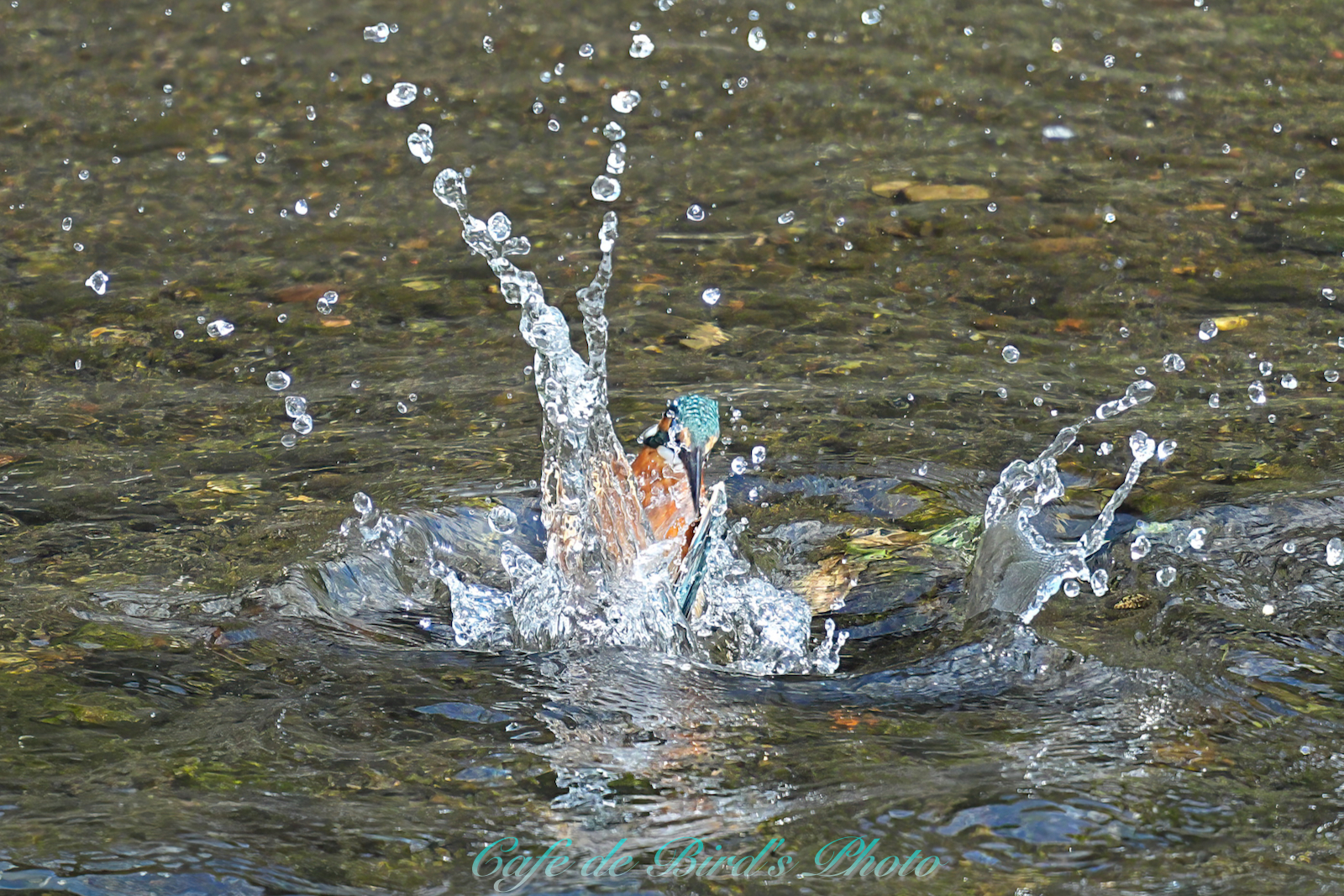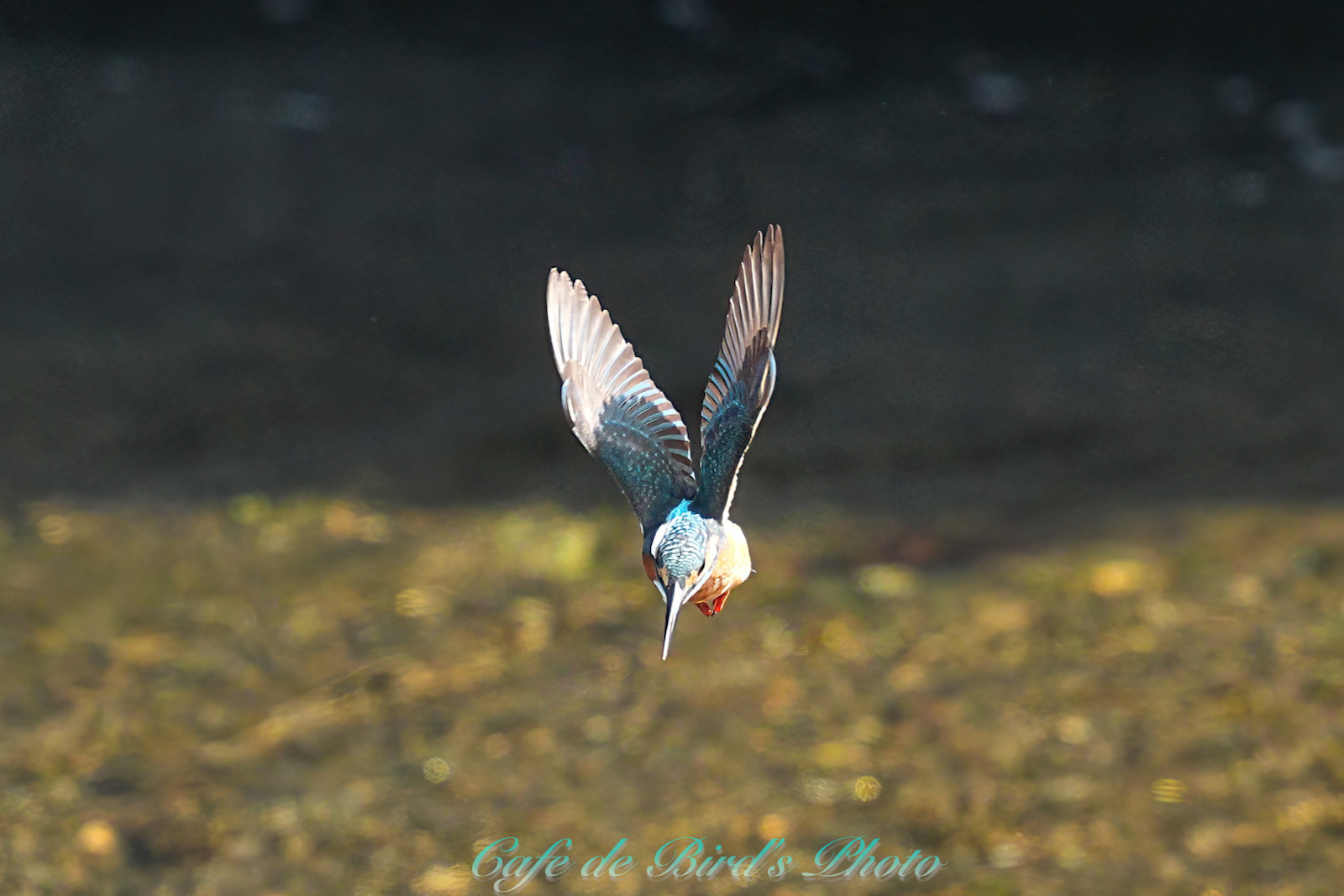 草の前に飛び込み小魚を獲るが草にピントを取られてピンぼけ