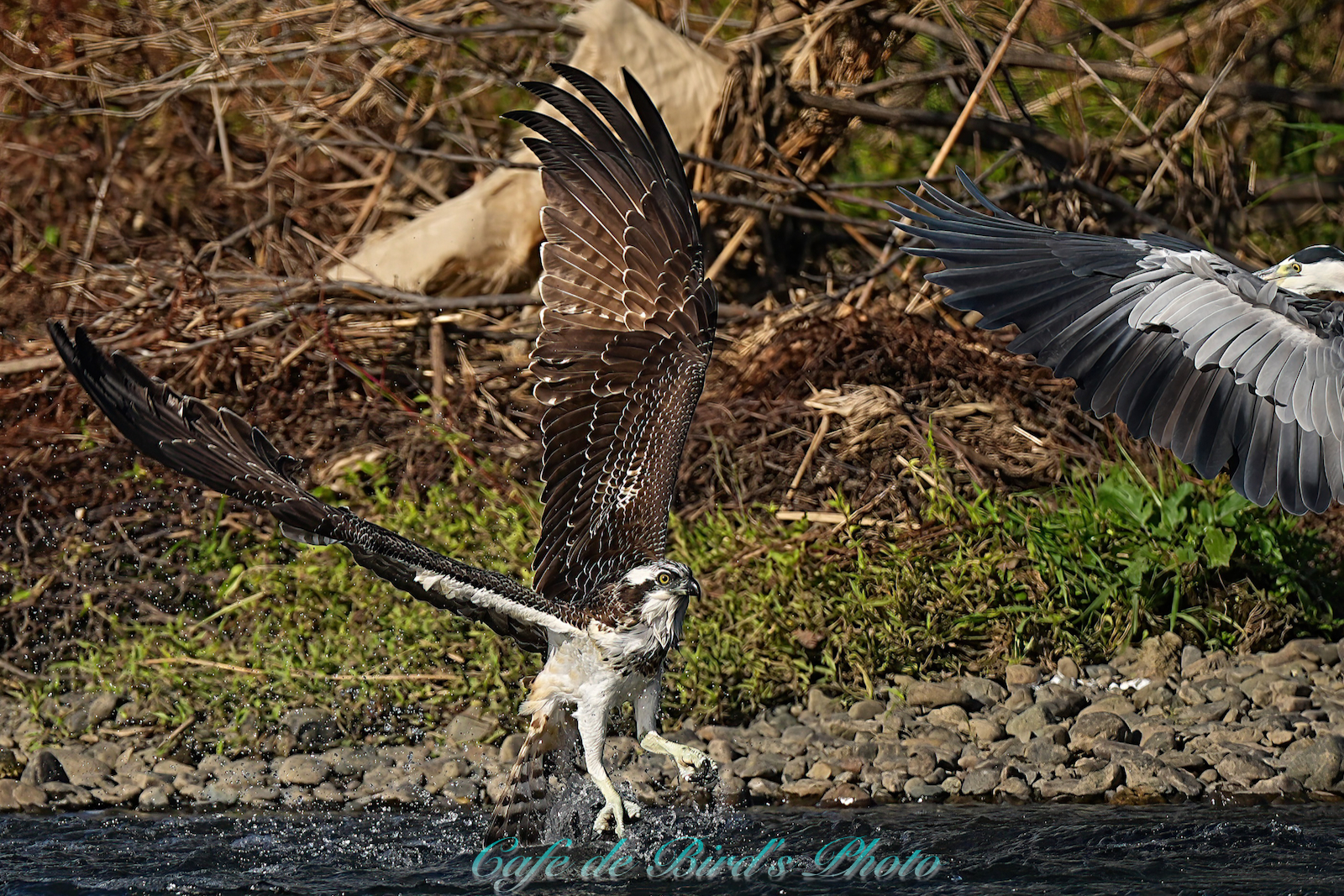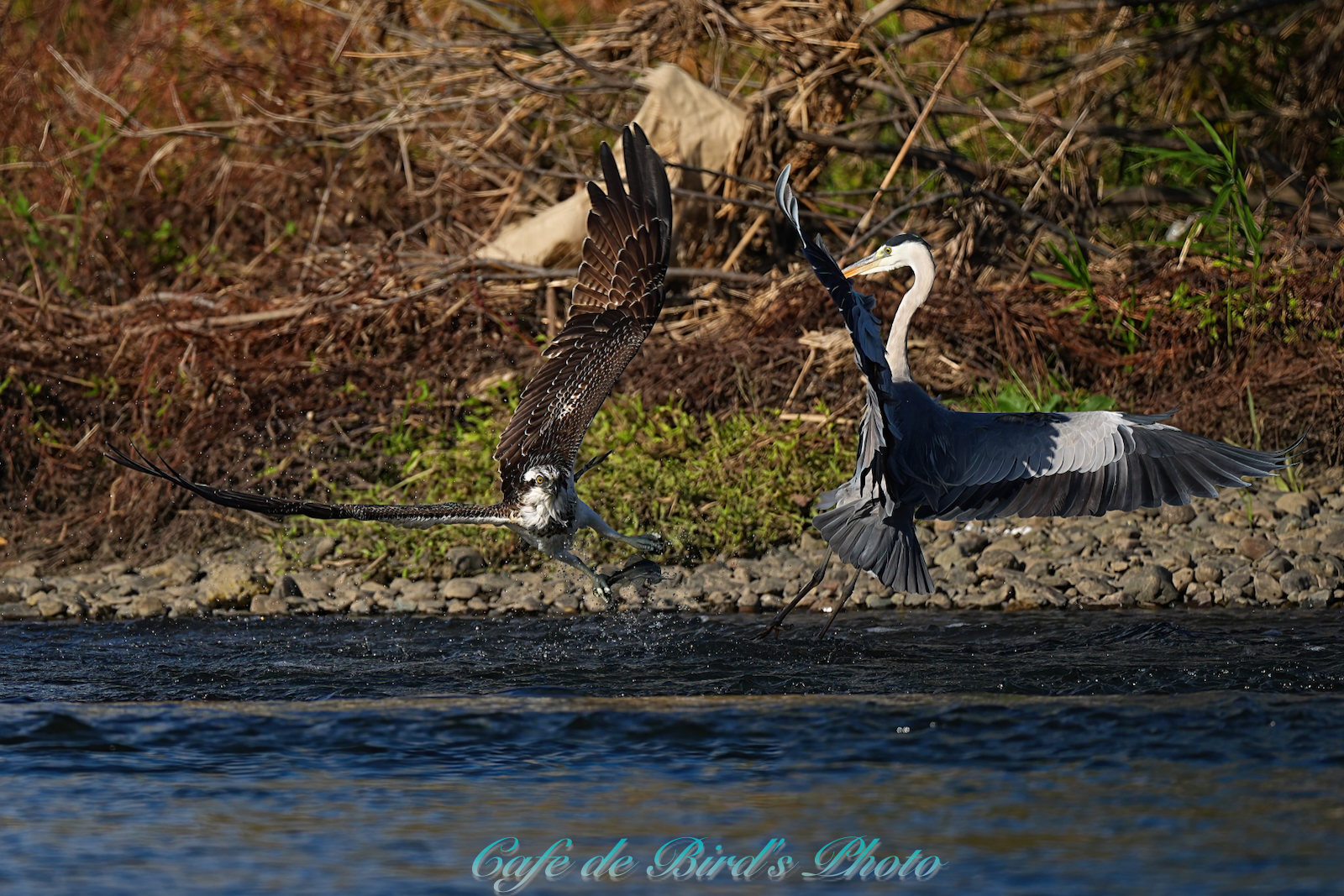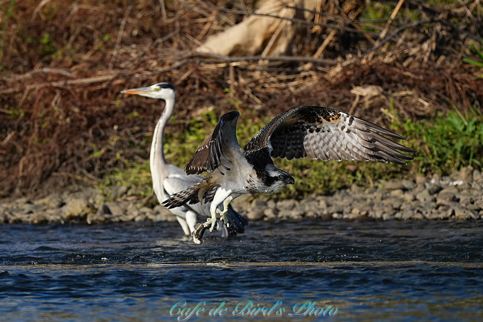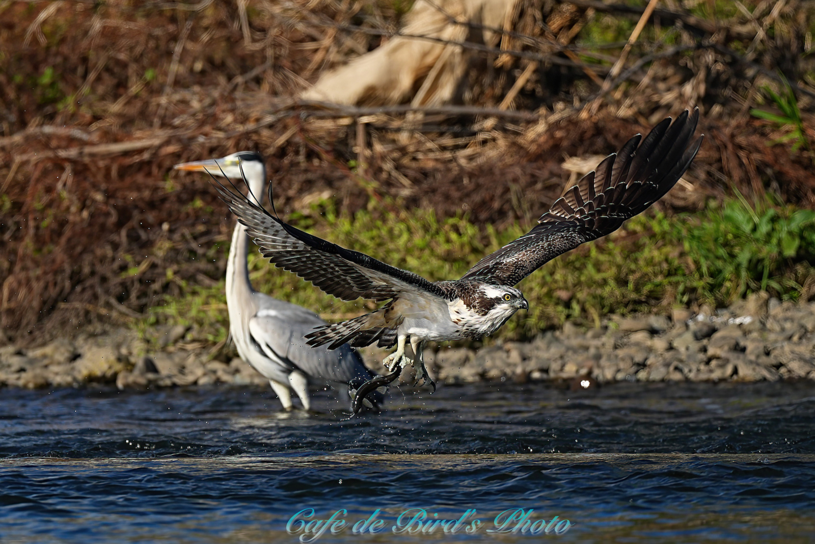 飛び込んでアユを獲りましたが離水時にアオサギに邪魔され