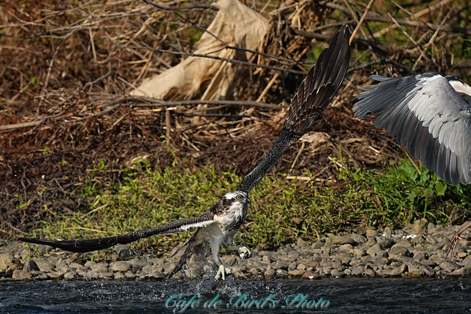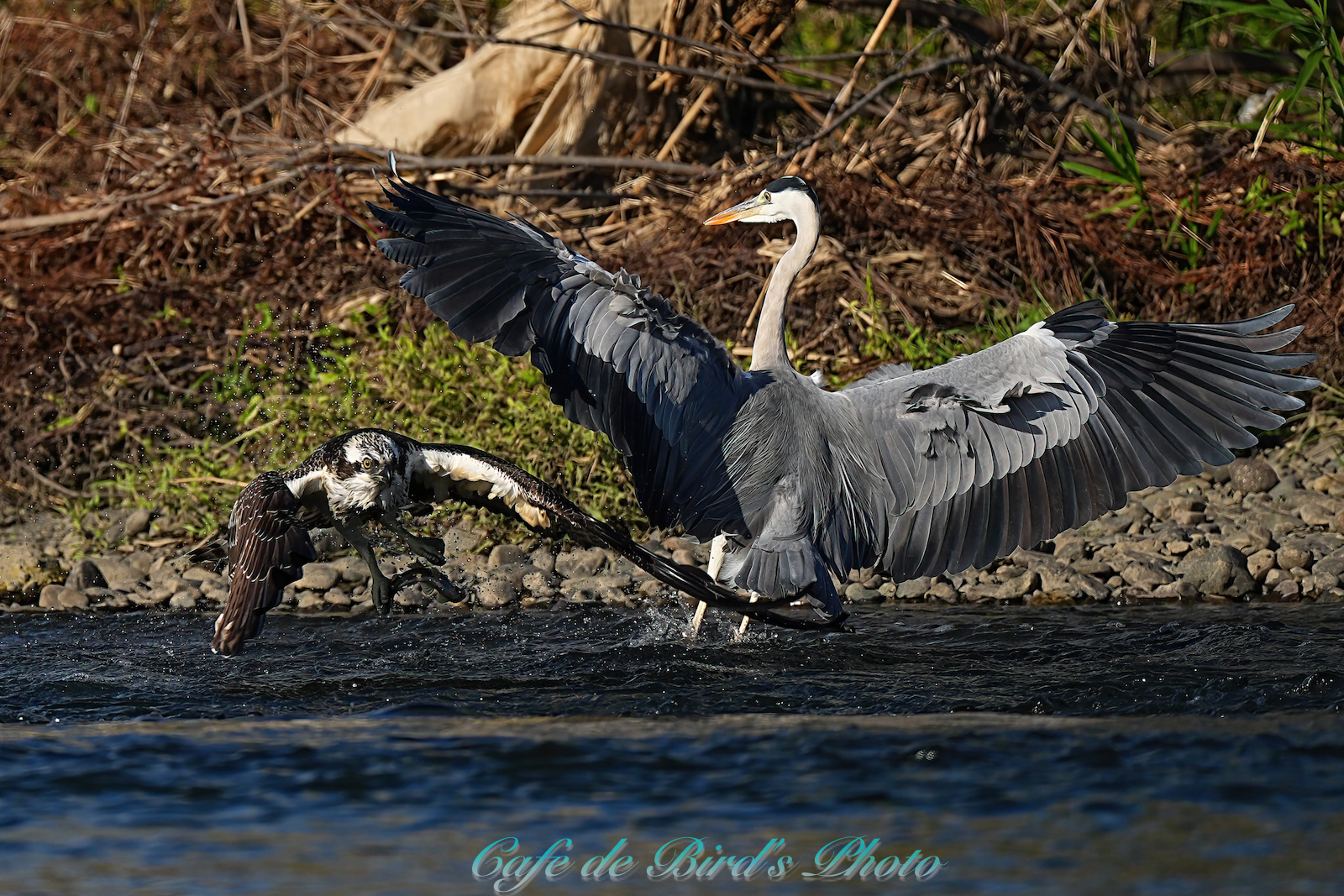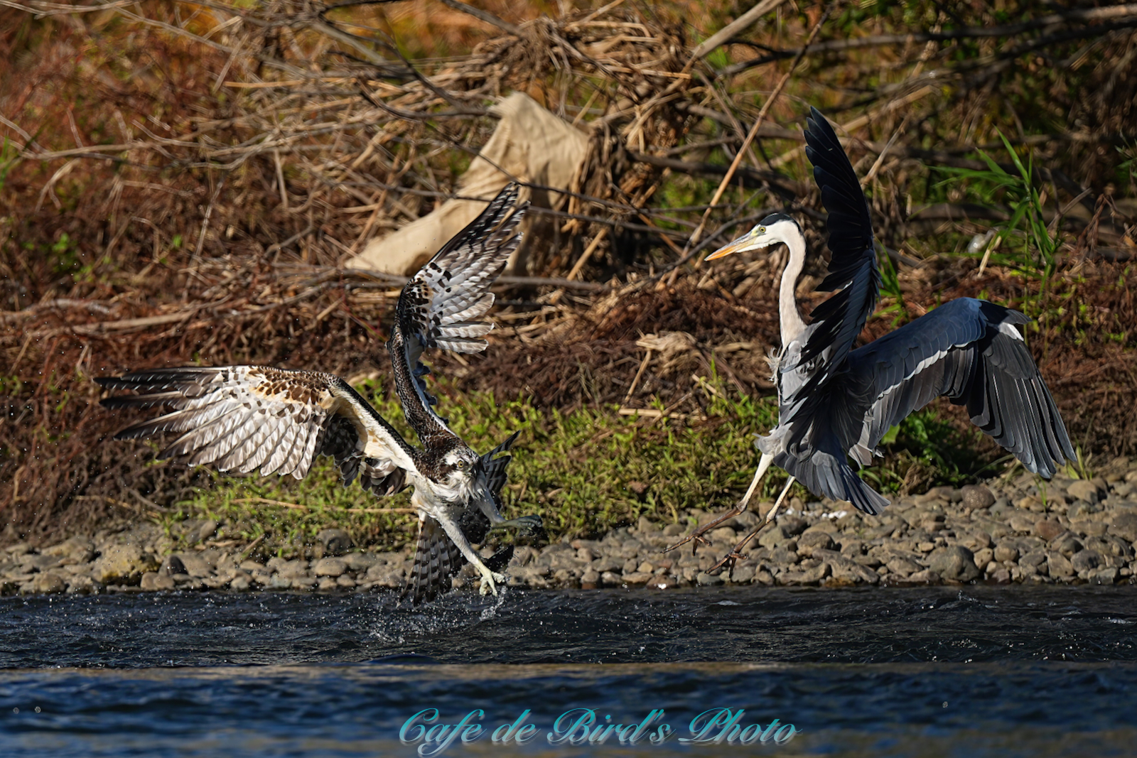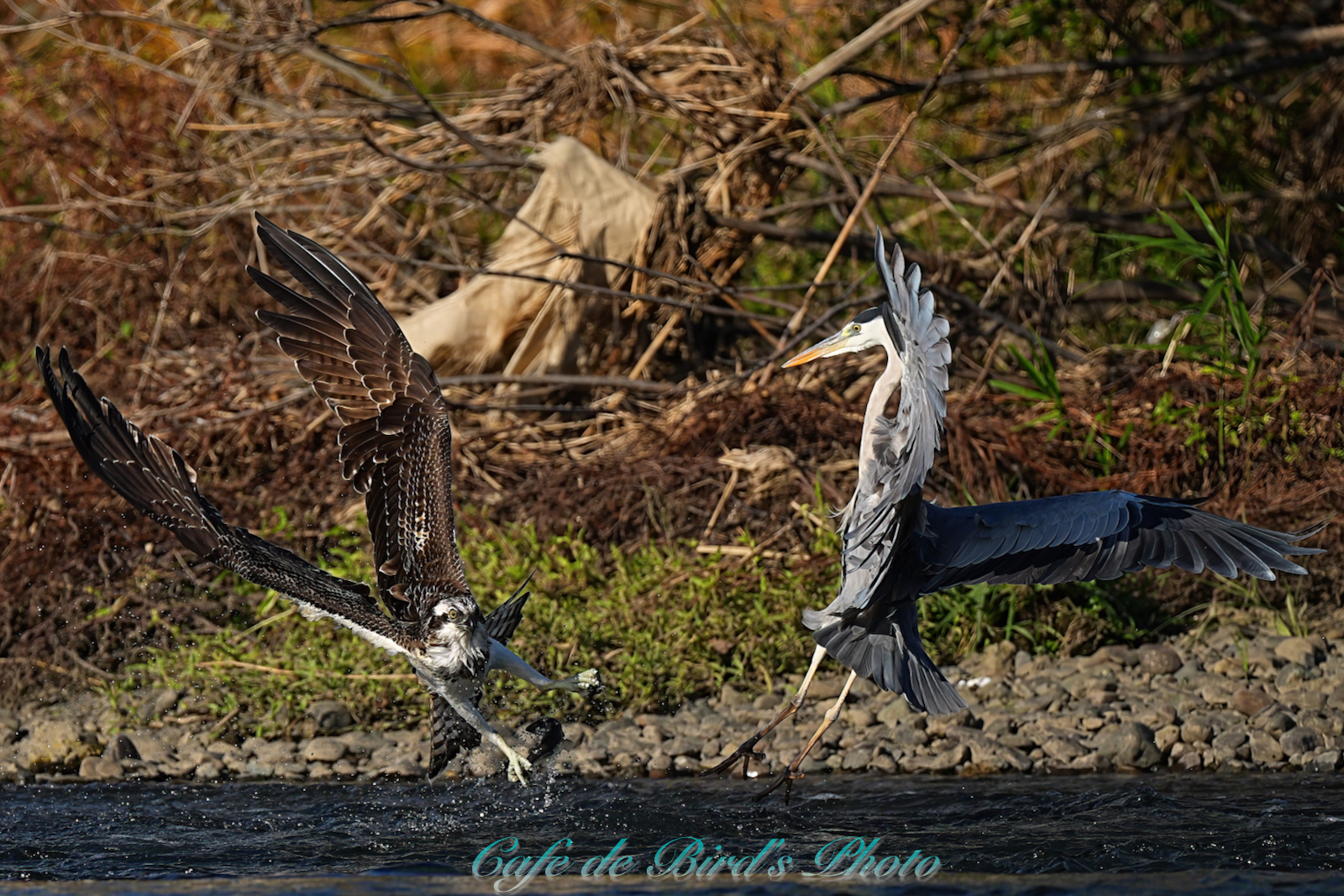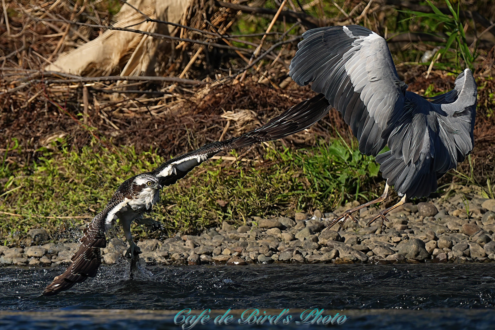 飛び込んでアユを獲りましたが離水時にアオサギに邪魔され