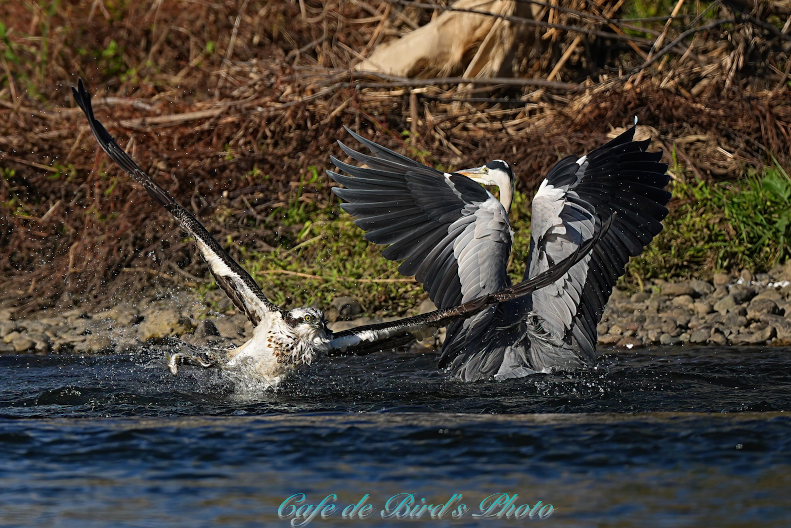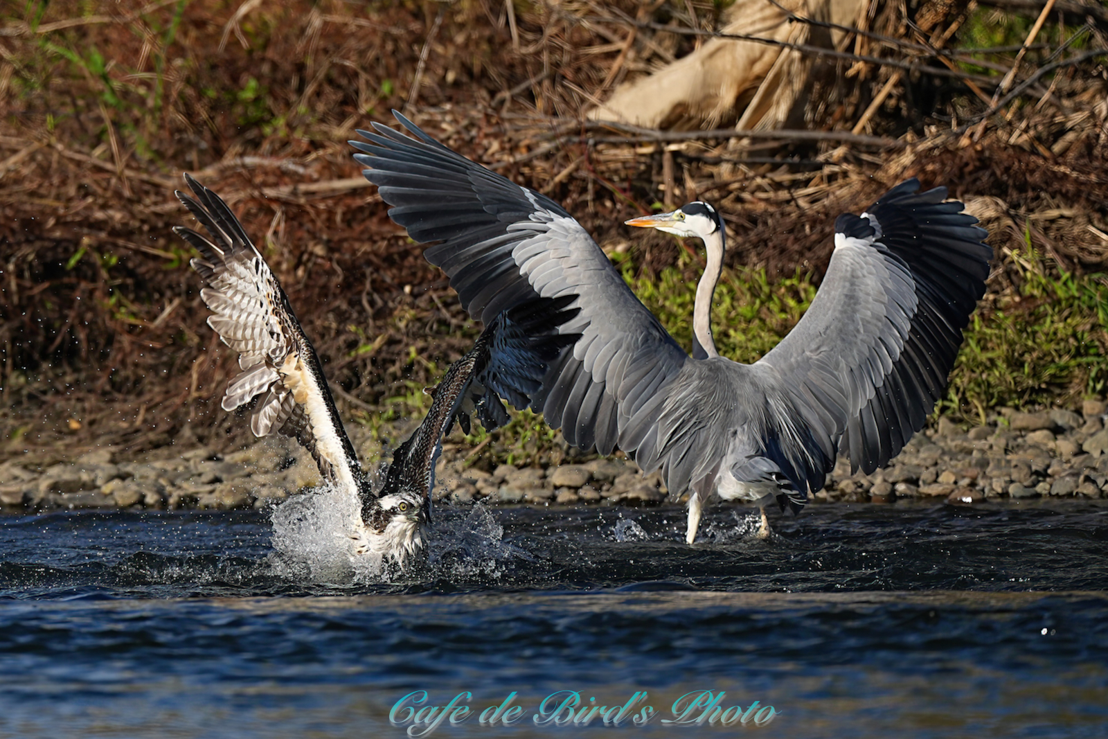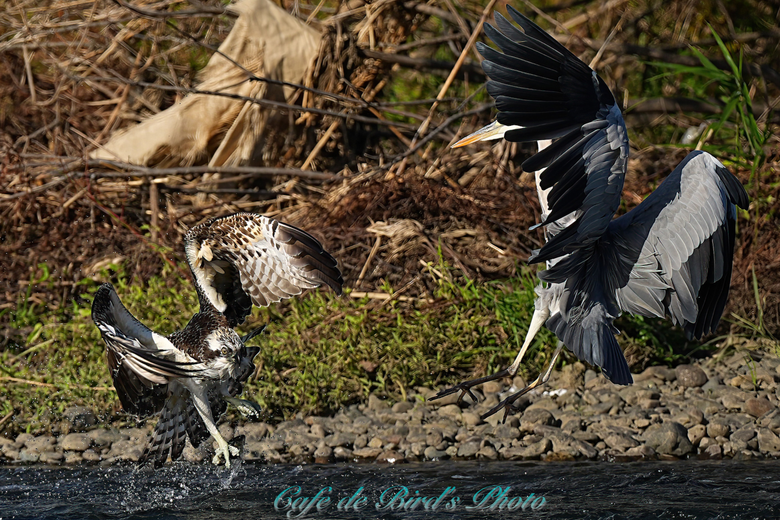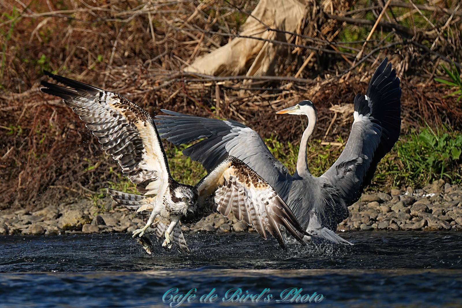 飛び込んでアユを獲りましたが離水時にアオサギに邪魔され