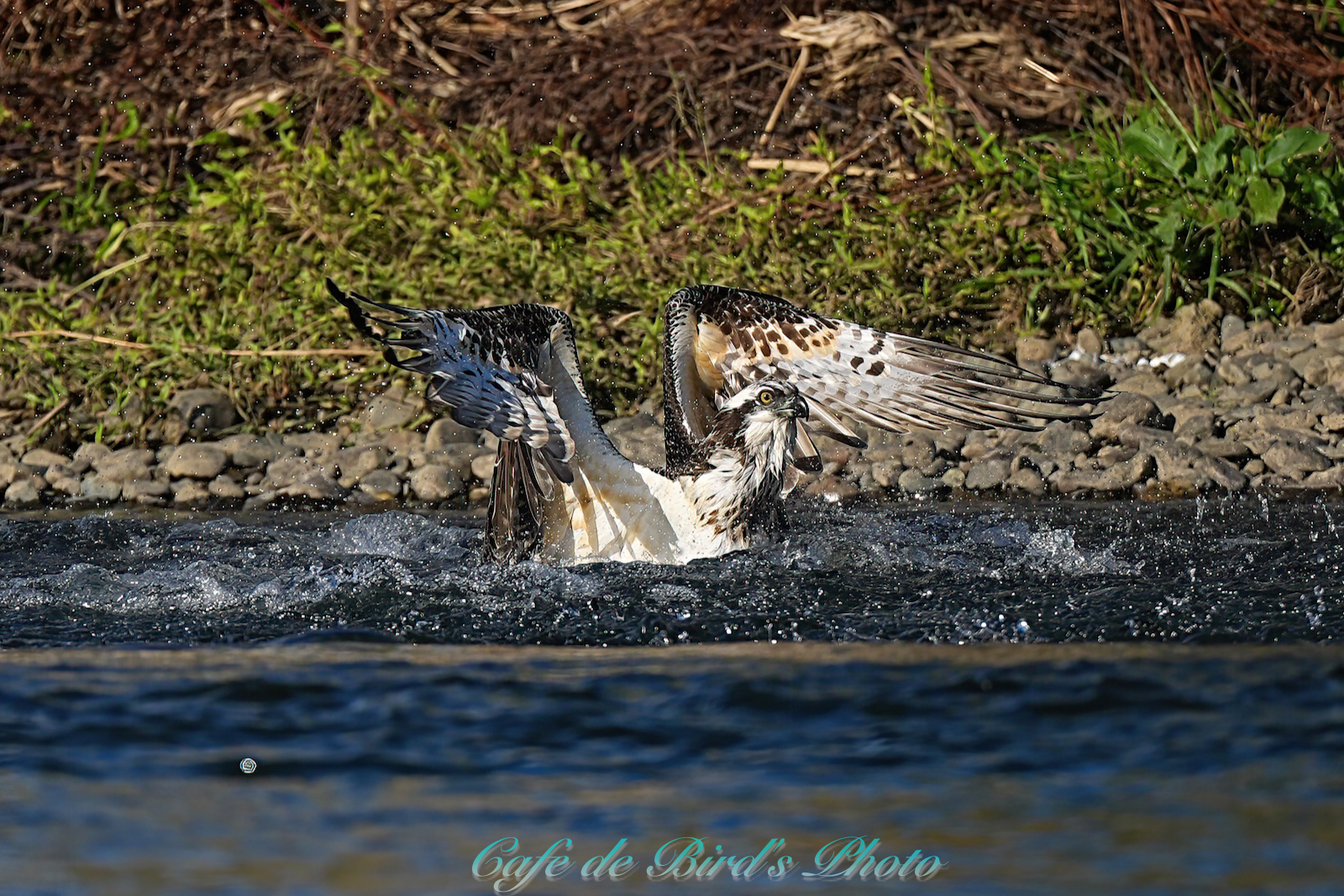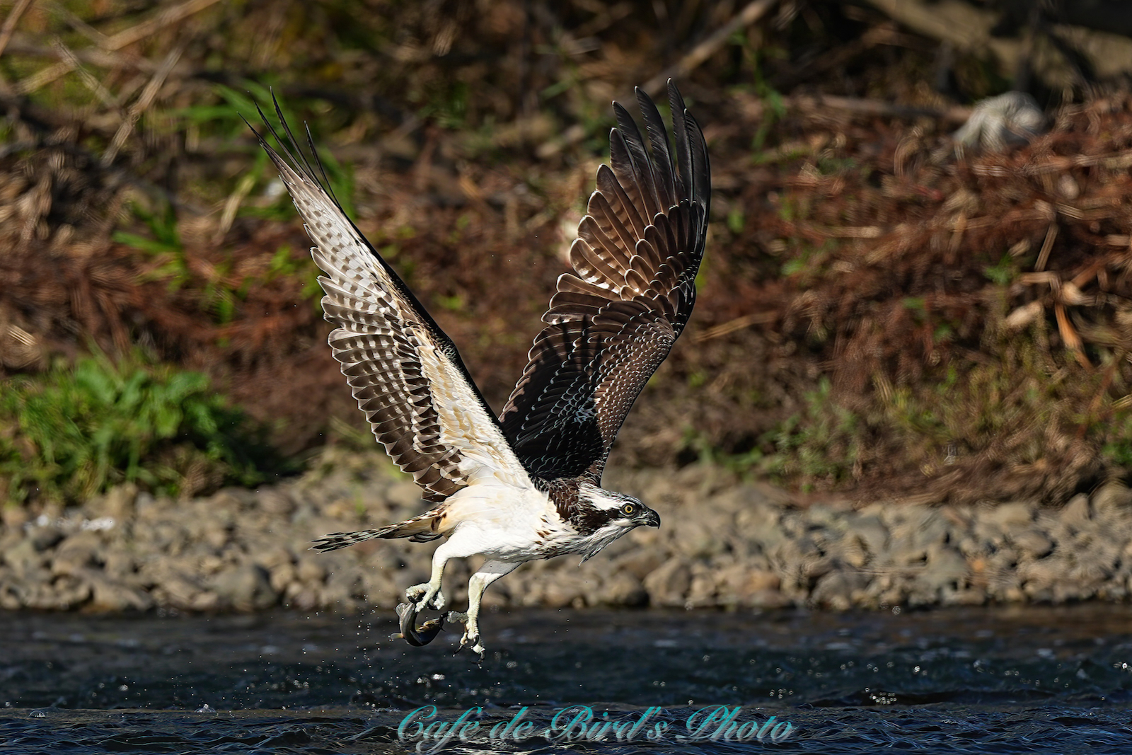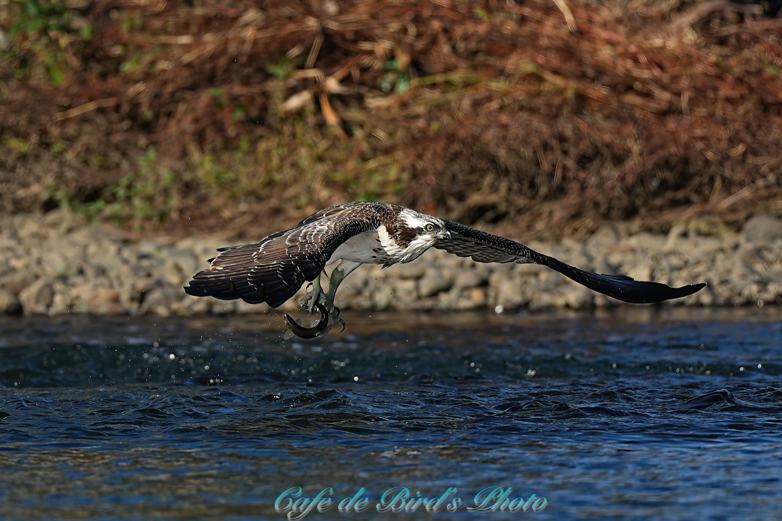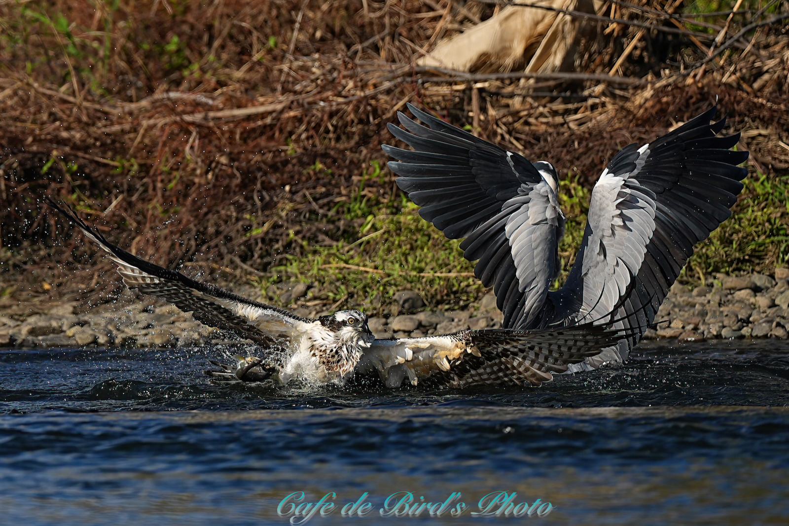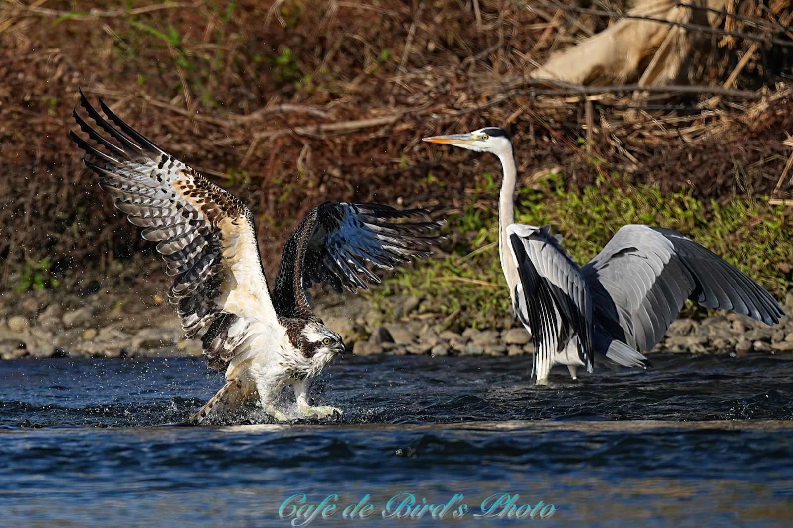 飛び込んでアユを獲りましたが離水時にアオサギに邪魔され