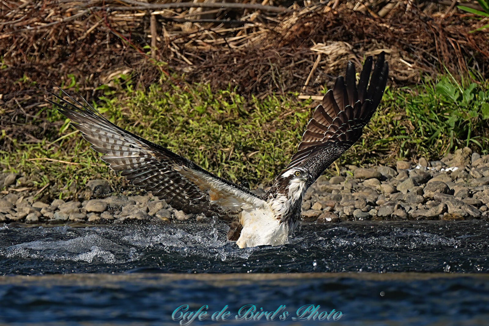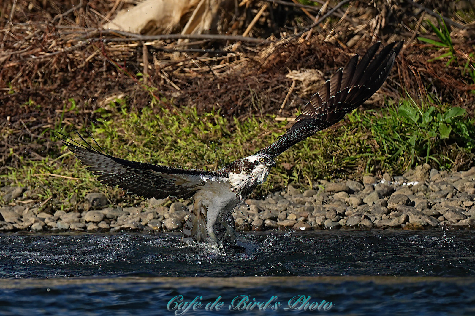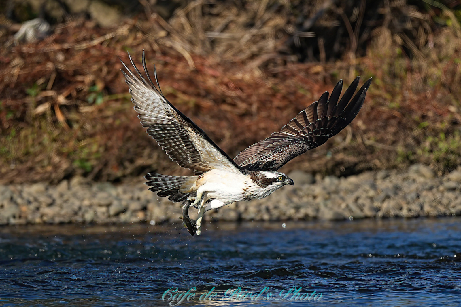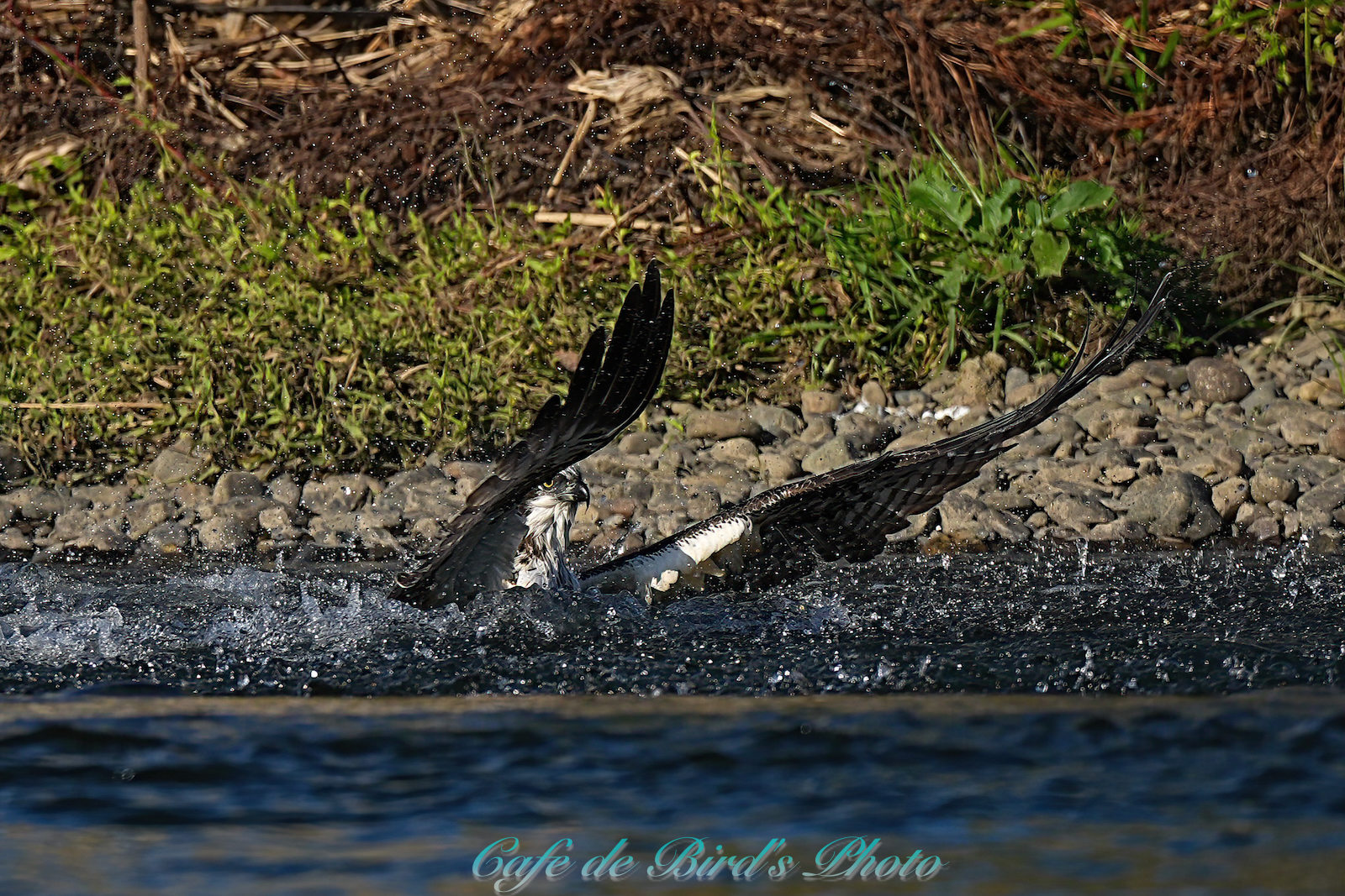飛び込んでアユを獲りましたが離水時にアオサギに邪魔され