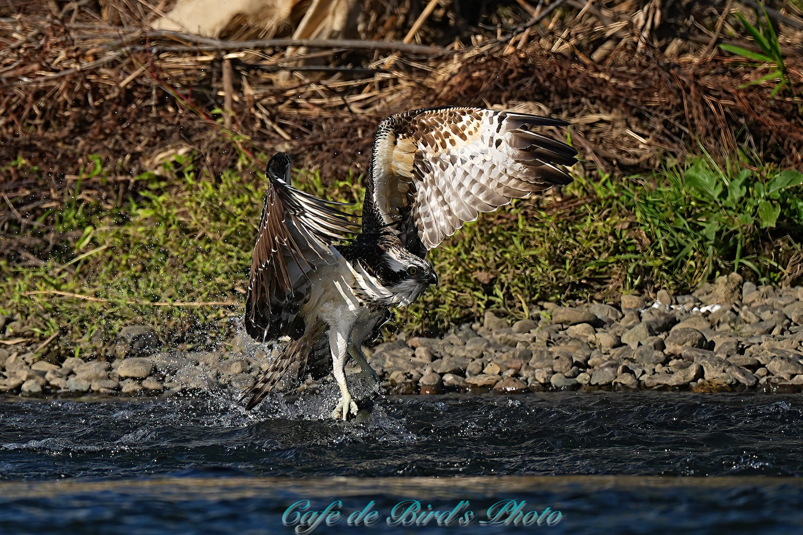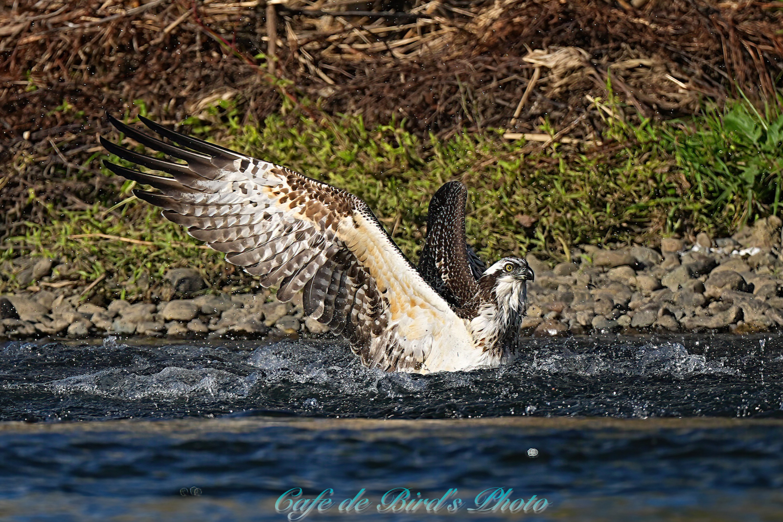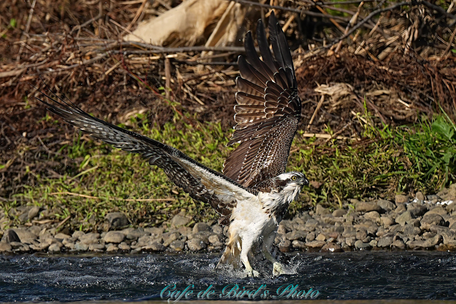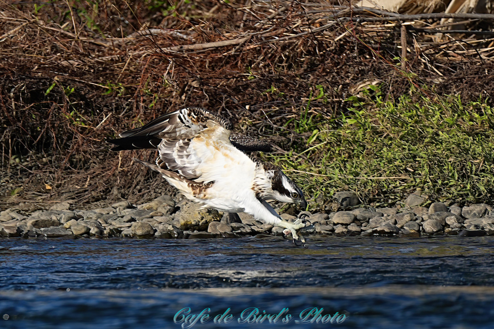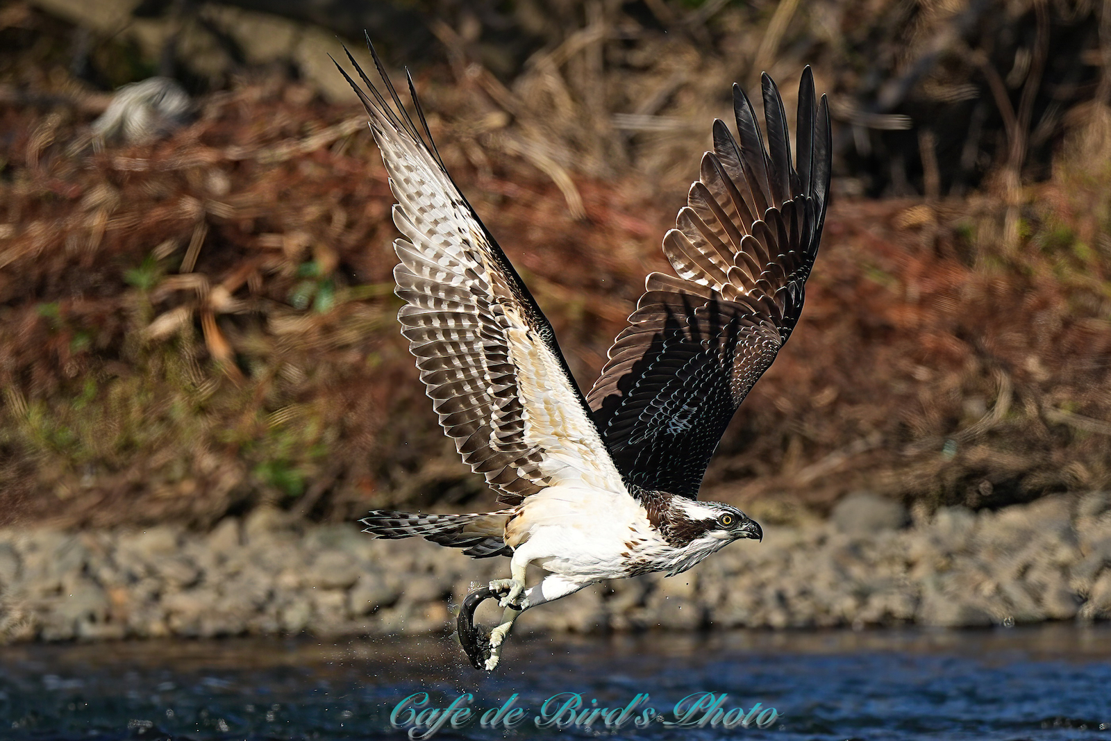 飛び込んでアユを獲りましたが離水時にアオサギに邪魔され